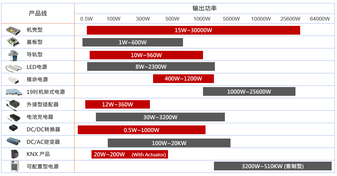 明緯秉持著持續(xù)創(chuàng)新的精神,每年新增10%新品,至今提供全方位之電源供應器產(chǎn)品,瓦特數(shù)涵蓋 0.5W~25,600W,主要產(chǎn)品類別有 AC/DC 電源供應器、LED驅(qū)動電源、AC/DC 充電器、DC / DC轉(zhuǎn)換器和DC / AC 逆變器,提供廣泛產(chǎn)品類別以滿足不同產(chǎn)業(yè)客戶之應用需求。
