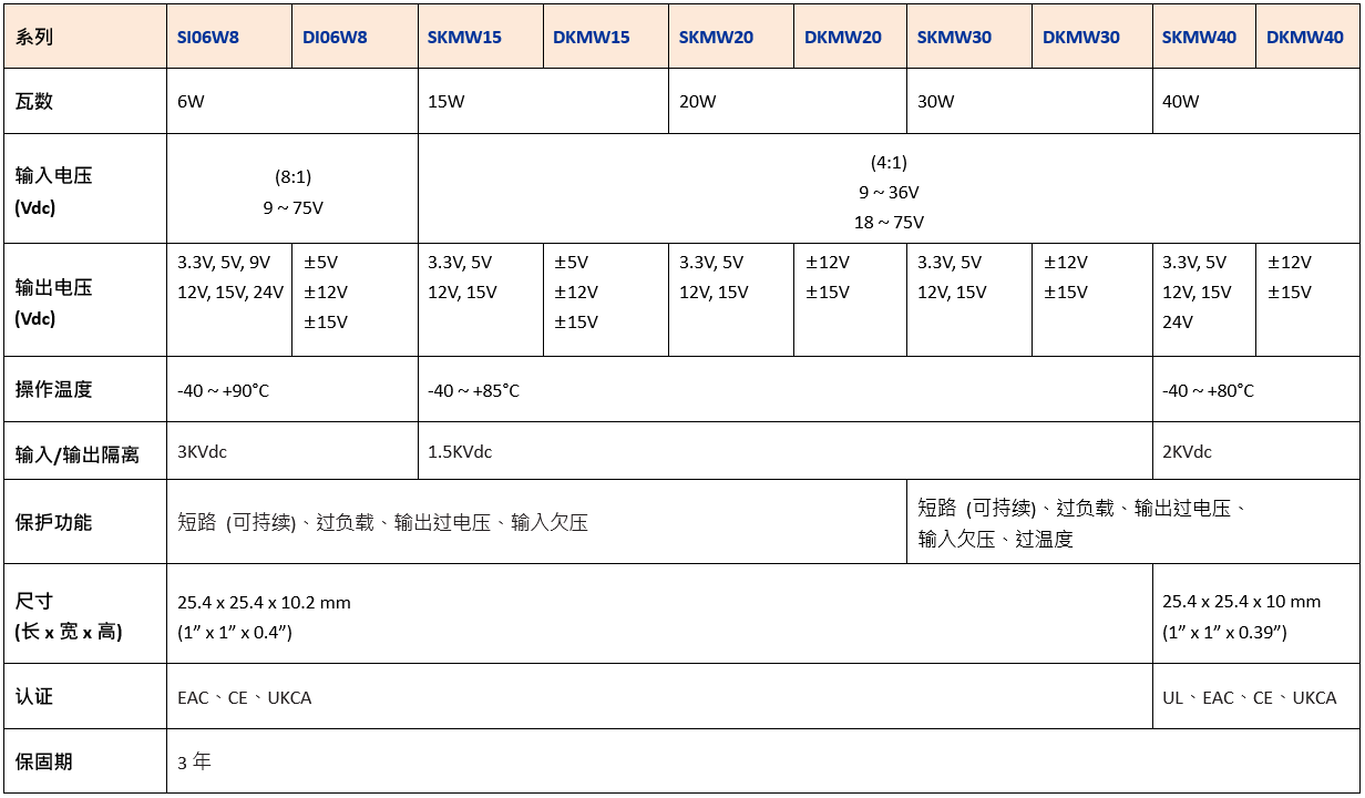 明緯繼推出 1" x 1" 6W/15W/20W/30W 寬壓輸入 DC-DC 轉換器后廣受好評,為滿足 1" x 1" 更高瓦數(shù)的需求,新推出了 4:1 輸入 40W 的單組輸出 SKMW40 及雙組輸出 DKMW40 系列。