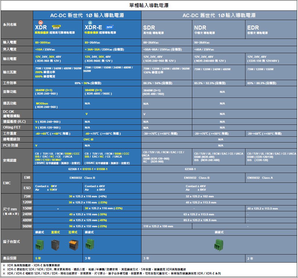 XDR-E 系列:75W~960W 全新世代 1? 輸入超薄性價(jià)兼?zhèn)鋵?dǎo)軌電源