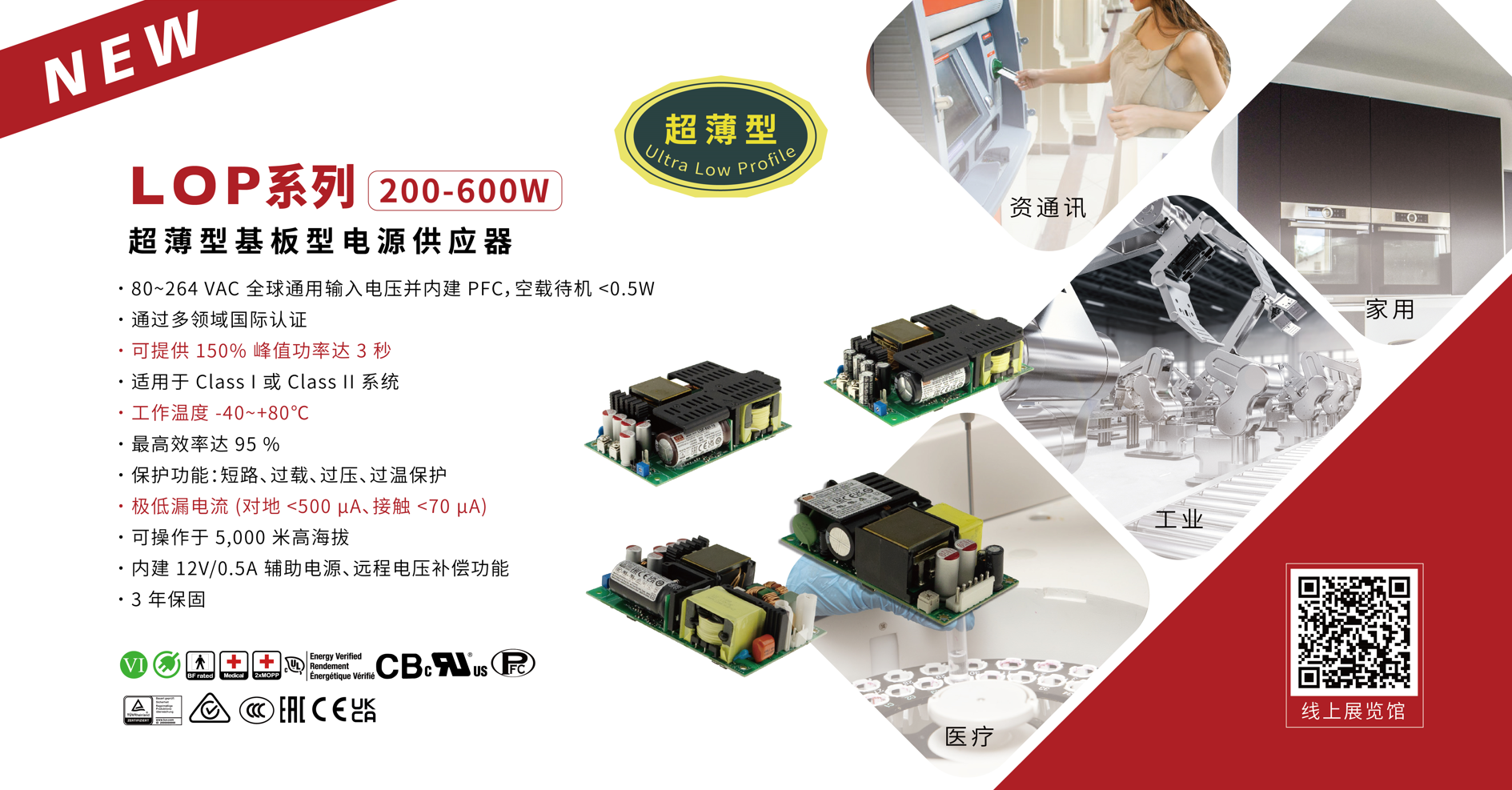 明緯超薄基板型LOP系列,功率涵蓋200~600W,5" x 3" 尺寸下功率可至 600W、具備 150% @ 3 秒供載能力、-40~+80℃更寬工作溫度,同樣通過多領(lǐng)域國際認證,適用于資通訊、醫(yī)療、工業(yè)、家居行業(yè)。