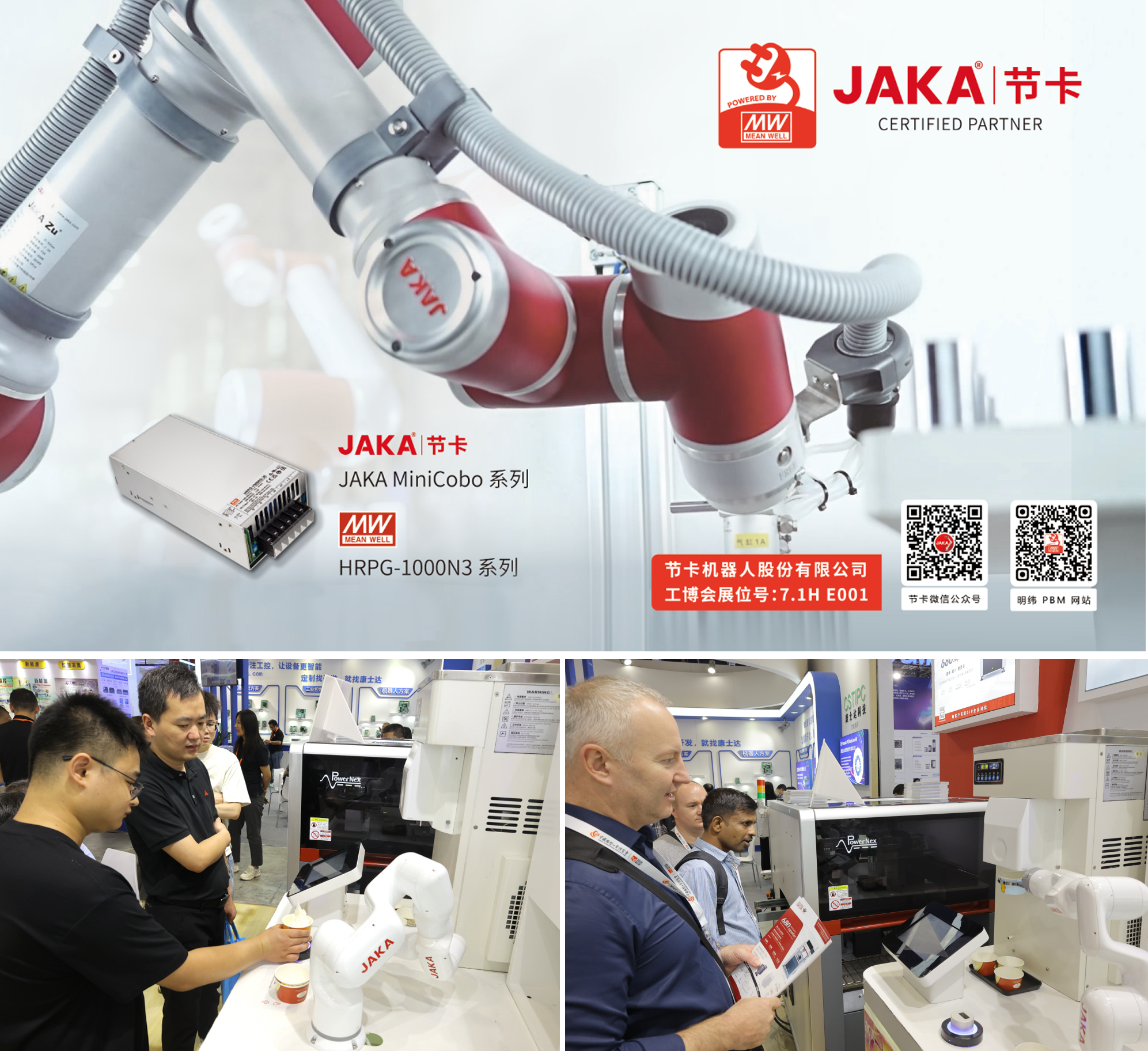 本次展會(huì)特別邀請(qǐng)Powered by MEAN WELL客戶(hù)——JAKA機(jī)器人聯(lián)合展出。JAKA協(xié)作機(jī)器人,使用的是明緯電源HRPG-1000N3系列,輸入電壓范圍為90~264VAC,可提供12V~48V額定電壓,滿(mǎn)足各種工業(yè)設(shè)備需求,320%峰值功率,可支持并聯(lián)使用,具有遙控功能。JAKA冰激凌機(jī)器人到場(chǎng),給明緯展位人氣助力。
