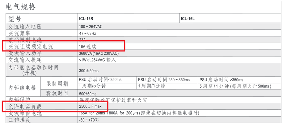 根據(jù)以下ICL-16R規(guī)格書得知其交流連續(xù)額定電流為16A,最大允許電容負載為2500μF。