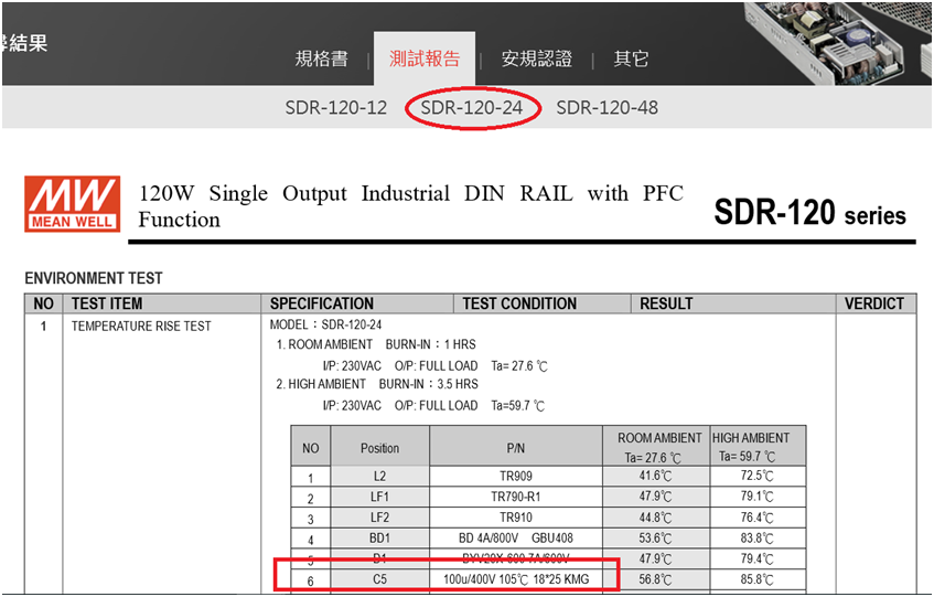 根據(jù)以下明緯官網(wǎng)SDR-120-24測試報告中環(huán)測測試數(shù)據(jù)得知輸入大電容容值為100μF。