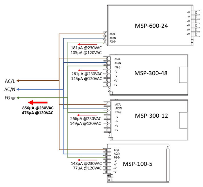 圖1顯示了明緯單臺模塊電源產(chǎn)品 NMP1K2-HHEKC#-01的漏電流測試結(jié)果,該機型由24V,12V,48V和5V四個輸出模塊組成。圖2顯示了使用四臺單輸出電源時的總漏電流,四臺機型分別為MSP-600-24、MSP-300-12、MSP-300-48與MSP-100-5。