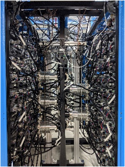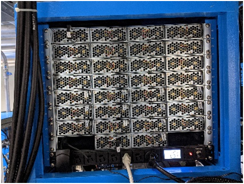 該標(biāo)案規(guī)劃使用多套96kW之高功率電源系統(tǒng)(圖三),使用電源系統(tǒng)輸出的電力驅(qū)動全固態(tài)射頻功率放大器(Radio Frequency Power Amplifier)叢集(圖四)產(chǎn)生高頻能量,匯集高頻能量供應(yīng)電子于趨近光速運(yùn)行所需之能量(圖五),全部電源系統(tǒng)最大輸出直流功率將近800kW !