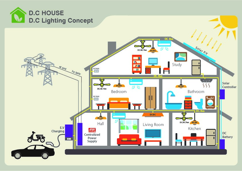 隨著環(huán)保意識抬頭,以及節(jié)能減碳的需求,未來電動車以及綠能會越來越普及;高壓直流集中供電有可能成為未來供電的方式。如圖3示意圖,房間內(nèi)架構(gòu)高壓直流供電總線,其來源可以選用明緯推出的高壓輸出機型UHP-1500-HV系列或RST-7K5-HV系列;輸出電壓選用380VDC,除了供應(yīng)電動車快速充電與房間內(nèi)各設(shè)備使用之外,同時也可以搭配降壓式DC – DC LED驅(qū)動器NHDD-40系列,作為房間內(nèi)的照明燈具驅(qū)動使用。