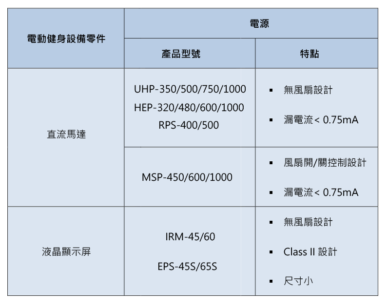 因此,電動(dòng)健身設(shè)備需要無(wú)風(fēng)扇或有風(fēng)扇開/關(guān)控制功能和低漏電流的電源,在選擇電源時(shí),建議考慮上述的需求。MEAN WELL產(chǎn)品線齊全,提供各種符合電動(dòng)健身設(shè)備電源需求的產(chǎn)品型號(hào),詳細(xì)產(chǎn)品信息可參考下表。