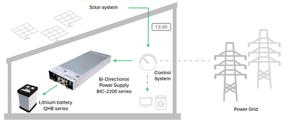 像 BIC-2200 這樣的雙向電源系統(tǒng)在家用儲能系統(tǒng)中尤其具有重要作用。例如,當(dāng)太陽能板產(chǎn)生的多余電力未被家庭設(shè)備立即消耗時,控制系統(tǒng)可以將這些電力導(dǎo)入雙向電源系統(tǒng),并將交流電(AC)轉(zhuǎn)換為直流電(DC),以高效地為家用儲能電池充電。這樣的無縫整合確保了產(chǎn)生的能量不會浪費(fèi),將多余的能量儲存起來,供日后使用。