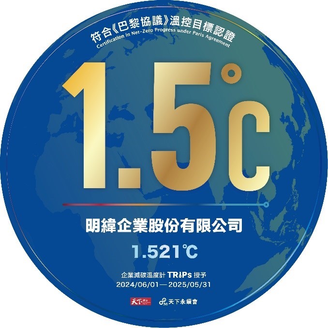 「企業(yè)減碳溫度計」(Temperature Rising Index for Pathways, TRIPs)由天下雜志與東海大學(xué)企業(yè)永續(xù)影響力中心共同發(fā)布,采用聯(lián)合國政府間氣候變化專門委員會(IPCC)發(fā)布之地球升溫情境,將全球升溫潛勢模型(Absolute Global Temperature Potential, AGTP)應(yīng)用在企業(yè)的溫度評分。以企業(yè)自定義的減碳與凈零目標(biāo),仿真升溫數(shù)據(jù),即為企業(yè)未來減排路徑的溫度。明緯經(jīng)此模型推算溫度評級為1.521°C,符合于巴黎協(xié)議升溫1.5°C控制目標(biāo),更遠(yuǎn)低于臺灣制造業(yè)2.79°C的平均溫度評級。